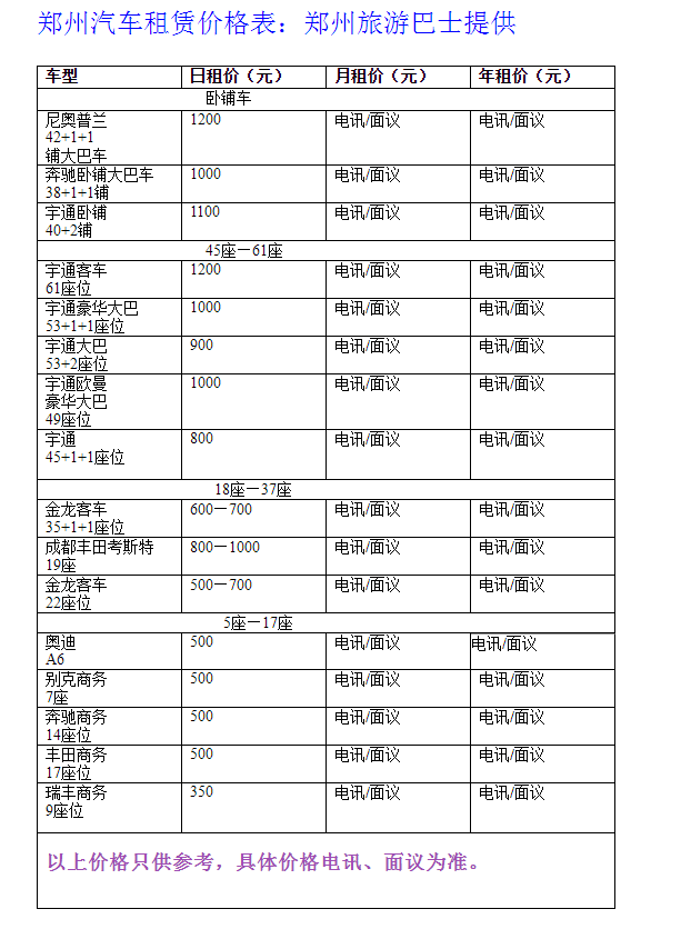 中原旅游巴士車型有:宇通,金龍,61座位,57+2座、53+2座、45+2座、35+2座、33+2座、22+6座、22座位、17座位、豐田考斯特出租17+1+辦公桌,瑞豐商務、別克商務,小車等等。